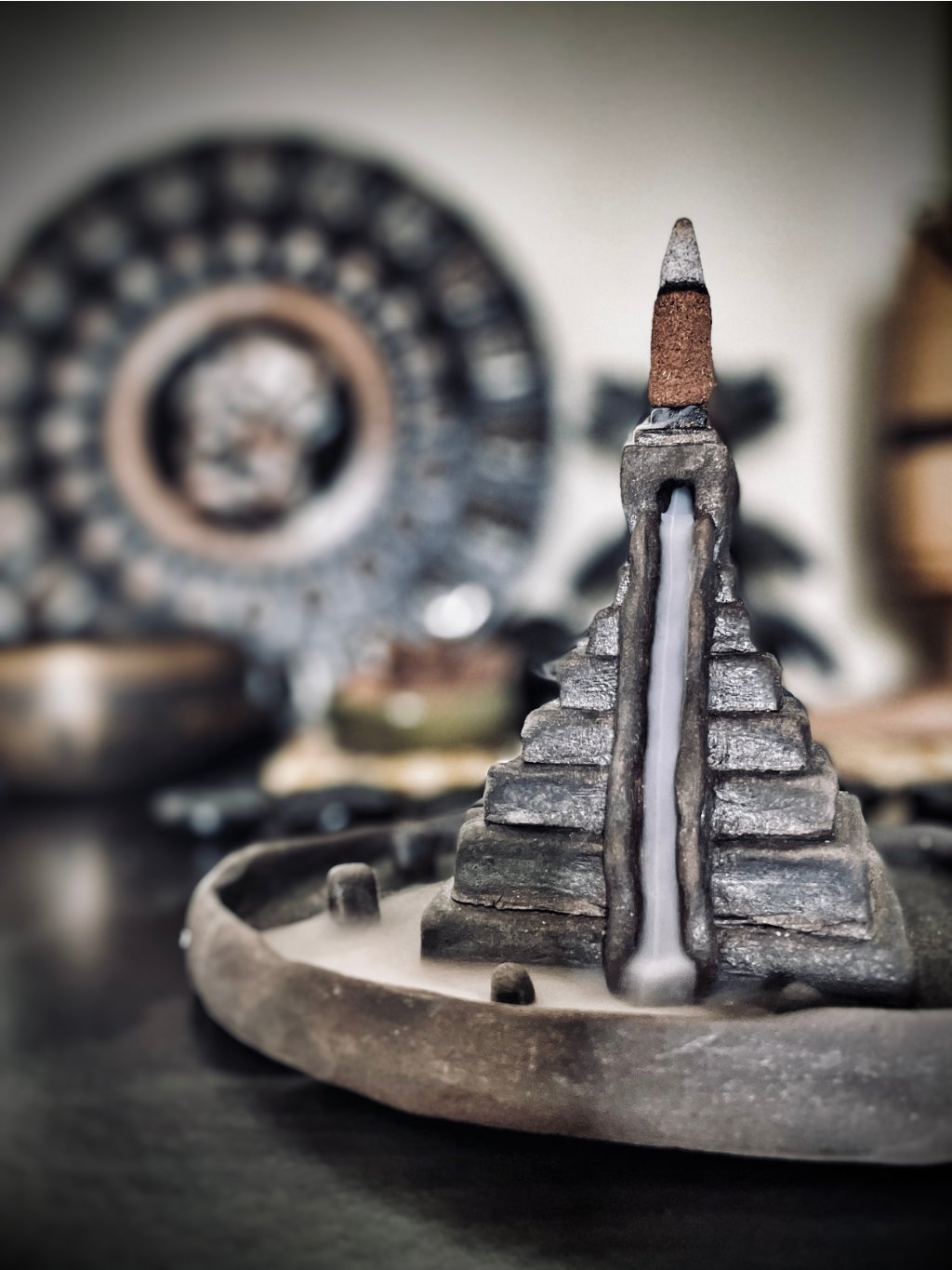 Stojan pro kužely na tekoucí dým napodobující mayskou pyramidu Tikal v Guatemale.